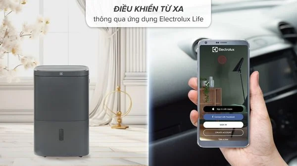 Một số dòng máy hút ẩm cao cấp của Electrolux hỗ trợ kết nối Wi-Fi, cho phép người dùng điều khiển máy từ xa qua ứng dụng trên điện thoại thông minh. Chỉ cần cài đặt ứng dụng, bạn có thể bật/tắt máy, thay đổi chế độ hoạt động hoặc theo dõi độ ẩm trong không khí bất kỳ lúc nào và ở đâu, cực kì tiện lợi cho những người bận rộn hoặc muốn tối ưu hóa việc sử dụng máy hút ẩm trong nhà.